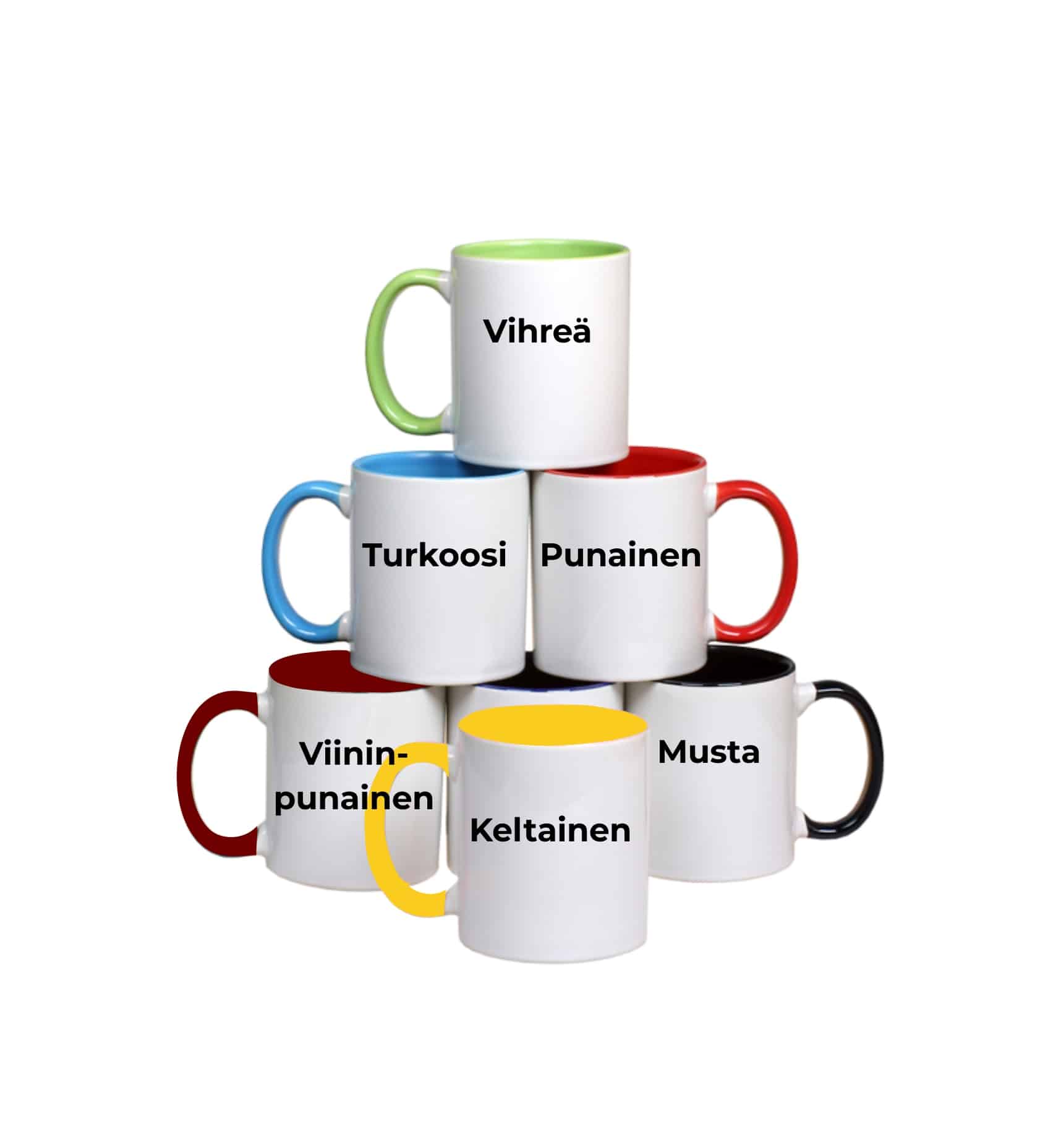 Keraaminen muki, jossa useita värivaihtoehtoja.